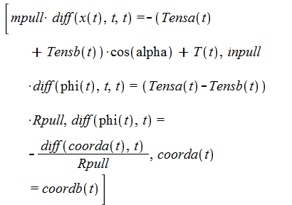 Variables x(t), coorda(t) and coordb(t) are translational coordinates, T(t), Tensa(t) and Tensb(t) are translational forces.