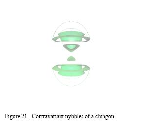 Each quaternion nybble in each hypercomplex fractal space is describing a different perspective of the same fractal. The octonion space is not the same space as the sedenion space. Furthermore, the tradition quaternion fractal is actually the contravariant nybble of the octonion space initializes as a sphere. The covariant nybble of the octonion space initializes as an antisphere or tractrisoid (see figure 16).