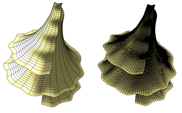 One of my coworkers brought in G.L. Legendre's book "Pasta By Design" (amazon.ca/dp/0500515808).  It is full of photographs and parametric equations for 92 shapes of pasta.  Of course, we had to set about plotting his equations in Maple.  Orginally I was going to post about this before Maple 16 came out, but I was struck with how much better plots looked in the Maple 16 pre-release and so I decided to wait.   As one example, here are the parametric equations for Giglio Ondulato noodles plotted using the default 3D plot settings in Maple 16 and Maple 15.