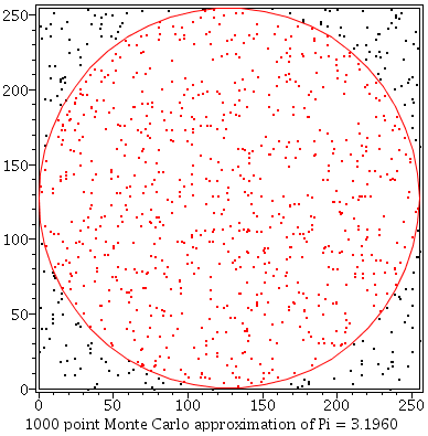 In a previous post, I promised to write about testing the quality of pseudo-random number sequences.  I'll post later about some of the statistical tests often used, but I first wanted to mention a sort of practical test one can do. One of the many things you might want to do with pseudorandomly generated numbers is Monte Carlo integration/simulatation/etc.  As mentioned by acer in this comment, Monte Carlo integration can be shown to work better with some of the pseudorandom number generators (PRNGs) which are considered inferior in a statistical sense.  In this post, we will play with a simple Monte Carlo approximation of π.