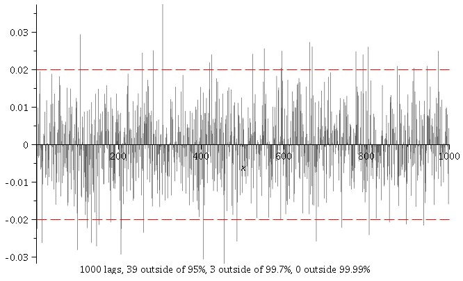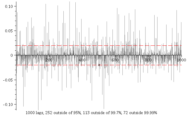 The dotted red lines below denote the 95% significance level (z-score > 2)  i.e lines below it do not denote significant correlation.  Below each plot is a summary of the number of correlations with z-scores >2, >3 and >4.  Looking at 1000 lags of a random sequence we should expect 50 lags outside of 95% (z>2), 3 outside of 99.7% (z>3) and maybe 1 outside of 99.99% (z>4).