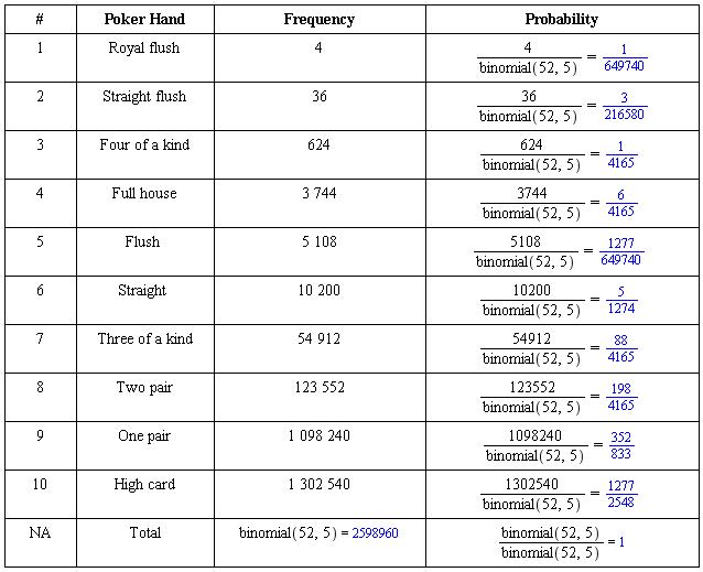 5 cards from a 52 cards deck. The frequencies are from wikipedia
