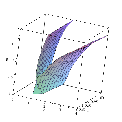 plotS := plots[:-implicitplot3d](S0(2, 1, x0, sigmaH) = S0(c, delta, xT, sigmaL), c = 0 .. 4, delta = 1 .. 3, xT = .8 .. 1)