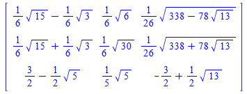 Matrix(3,3,{(1, 1) = 1/6*15^(1/2)-1/6*3^(1/2), (1, 2) = 1/6*6^(1/2), (1, 3) = 1/26*(338-78*13^(1/2))^(1/2), (2, 1) = 1/6*15^(1/2)+1/6*3^(1/2), (2, 2) = 1/6*30^(1/2), (2, 3) = 1/26*(338+78*13^(1/2))^(1/2), (3, 1) = 3/2-1/2*5^(1/2), (3, 2) = 1/5*5^(1/2), (3, 3) = -3/2+1/2*13^(1/2)},datatype = anything,storage = rectangular,order = Fortran_order,shape = [])
