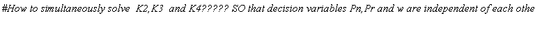 @acer I am optimizing a profit function with respect to three decision variables Pn,Pr, and w. When I solve the problem, I obtain conditions such as Pn(Pr,w), Pr​(Pn​,w), and w(Pn,Pr), which makes them appear dependent on each other. How can I simultaneuosly solve K2,K3 and K4 so that I can obtain the optimal values of Pn, Pr​, and w simultaneously as independent decision variables?