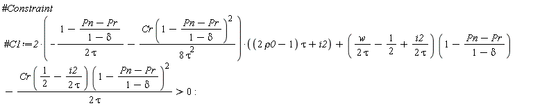 C1 := (2*(-(1-(Pn-Pr)/(1-delta))/(2*tau)-Cr*(1-(Pn-Pr)/(1-delta))^2/(8*tau^2)))*((2*rho0-1)*tau+i2)+(w/(2*tau)-1/2+i2/(2*tau))*(1-(Pn-Pr)/(1-delta))-Cr*(1/2-i2/(2*tau))*(1-(Pn-Pr)/(1-delta))^2/(2*tau) > 0