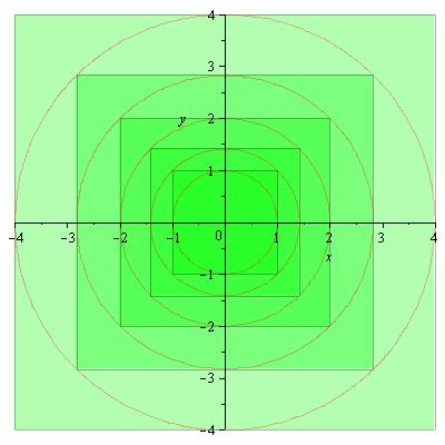 b := implicitplot([seq(x^2+y^2 = (sqrt(2)^n)^2, n = 0 .. 4)], x = -5 .. 5, y = -5 .. 5, numpoints = 5000):