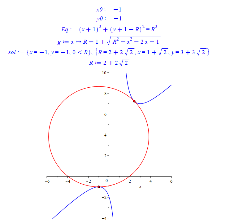sol:=solve({f(x)=g(x),D(f)(x)=D(g)(x),y=f(x),R>0}, {x,y,R}, explicit);