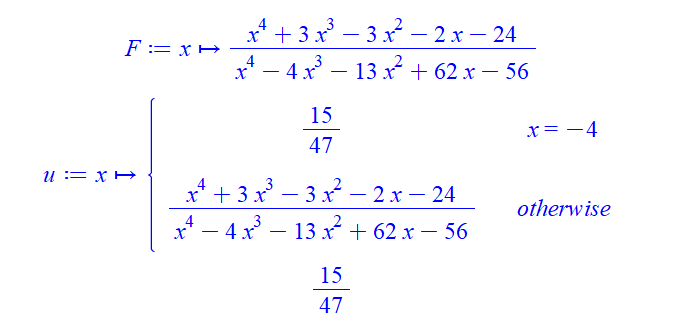 u:=unapply(piecewise(x=-4, limit(F(x), x=-4), true, F(x) ), x);
