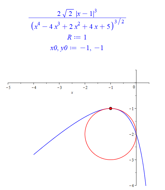 simplify(Curvature(<x,f(x)>,x)) assuming real; # The curvature at an arbitrary point