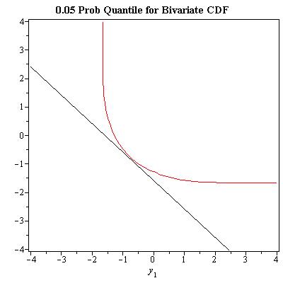 p1 := contourplot(numres1, y[1] = -4 .. 4, y[2] = -4 .. 4, axes = Boxed, title = ["0.05 Prob Quantile for Bivariate CDF", font = [TIMES, BOLD, 12]], contours = [0.5e-1], view = [-4 .. 4, -4 .. 4]):