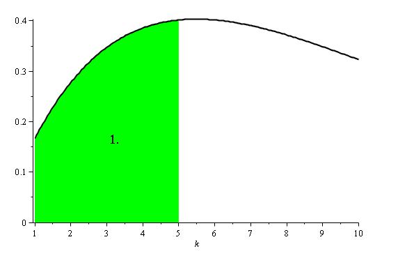 display({plot(f(k), k = 1 .. 5, filled = true, color = green), plot(f(k), k = 1 .. 10, color = black, thickness = 2), textplot([[3, .15, A]], align = {above, right}, font = [Times, Roman, 15])});