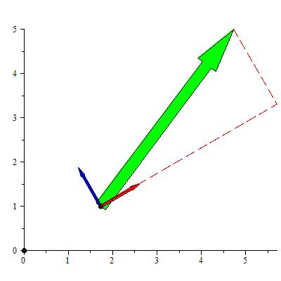 OK, here's the picture in that case.  The red and blue arrows are u[r] and u[theta], the green arrow is your v1, and the dashed lines show that this is approximately 4.60 * u[r] + 1.96*u[theta].