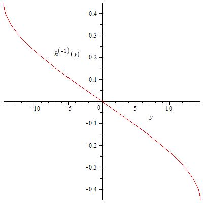 > plot([h(m),m, m = -1/sqrt(5) .. 1/sqrt(5)], labels = [y, 'h^``(-1)'(y)]);