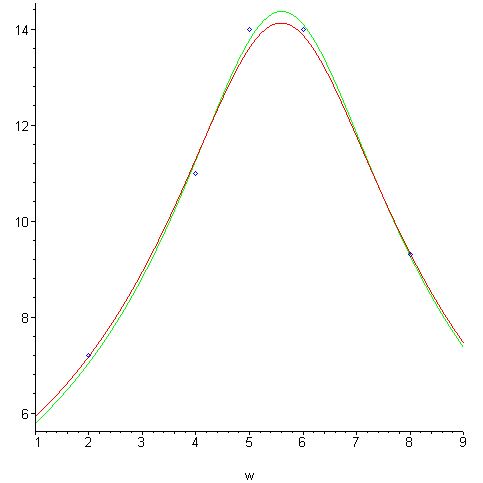 display(plot([resonance,resonance2],w=1..9,colour=[red,green]),pointplot(data,colour=blue));