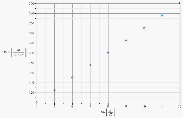 plots:-pointplot(`<|>`(`<,>`(Hb), `<,>`(DO2i)), useunits = [g/dL, mL/(:-min*m^2)], gridlines, size = [700, 450])