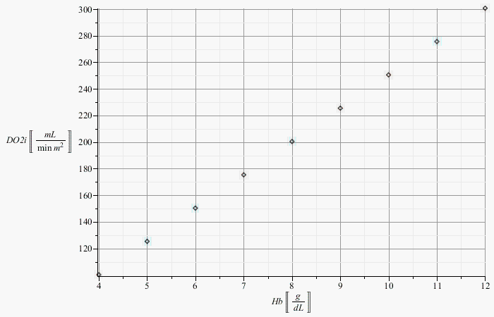 plots:-pointplot(`<|>`(`<,>`(Hb), `<,>`(DO2i)), useunits = [g/dL, mL/(:-min*m^2)], gridlines, size = [700, 450], labels = [InertForm:-Display('Hb')*Unit(g/dL), InertForm:-Display('DO2i')*Unit(mL/(min*m^2))])