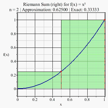 title = sprintf("Riemann Sum (%s) for f(x) = x² with n = %d\nExact: %.5f | Approximation: %.5f | Error: %.5f",