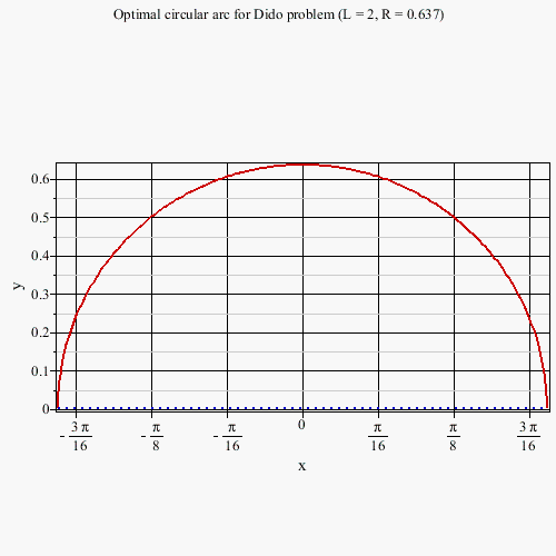title=sprintf("Optimal circular arc for Dido problem (L = %d, R = %.3f)", L_length, evalf(R)),