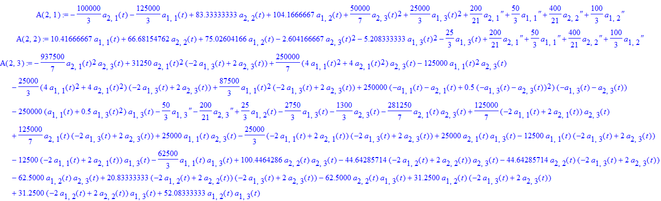 eq2 := 47619047.62*(-6*a[2,3](t)+6*a[3,3](t))*a[3,3](t)+142857142.8*a[3,3](t)*(-3*a[2,3](t)+3*a[3,3](t))+266666666.8*(-2*a[1,3](t)+2*a[2,3](t))*a[3,3](t)-16666666.67*(-6*a[2,3](t)+6*a[3,3](t))*(-3*a[2,3](t)+3*a[3,3](t))-25000000.00*(-2*a[1,3](t)+2*a[2,3](t))*(-3*a[2,3](t)+3*a[3,3](t))-25000000.00*(-6*a[2,3](t)+6*a[3,3](t))*(-2*a[1,3](t)+2*a[2,3](t))+300000000.0*a[3,3](t)*a[1,3](t)-41666666.68*(-6*a[2,3](t)+6*a[3,3](t))*a[1,3](t)-83333333.32*(-2*a[1,3](t)+2*a[2,3](t))*a[1,3](t)+166666666.7*a[1,1](t)+83333333.32*a[2,1](t)+50000000.00*a[3,1](t)+2227361110.*a[1,2](t)+1113680555.*a[2,2](t)+637573412.7*a[3,2](t)+1072222222.*a[2,3](t)+1072222222.*a[3,3](t)-428571428.5*a[3,3](t)^2-41666666.68*(-2*a[1,3](t)+2*a[2,3](t))^2+.9357142857e-5*diff(a[3,2](t),`$`(t,2))+.1637500000e-4*diff(a[2,2](t),`$`(t,2))+.3275000000e-4*diff(a[1,2](t),`$`(t,2))-.9357142858e-3*diff(a[3,1](t),`$`(t,2))-.1637500000e-2*diff(a[2,1](t),`$`(t,2))-.3275000000e-2*diff(a[1,1](t),`$`(t,2))