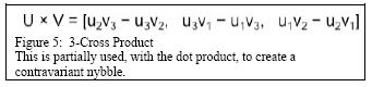 To make the covariant nybble we need to use a 7-vector cross product rather than the 3-vector cross product. However, the last four elements add no additional value, therefore, they are discarded. The dot product of the covariant nybble is composed of the sum of eight products (see figures 8, 9 and 10 for examples on visualizing the 3-cross and 7-cross products, and their joining or superimposing of each other).