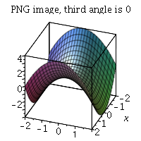 plot3d(x^2-y^2,x=-2..2,y=-2..2,axes=boxed,orientation=[20,60,0],title="PNG image, third angle is 0");