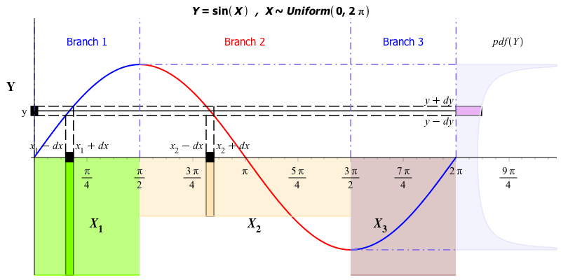 Here is a picture to help understand how to get the pdf of Y =  𝟇(X) for a non monotone function 𝟇 (the case of a monotone function directly comes from this latter).