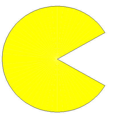Pacman's mouth only has three stages: open, half open and close. Let's take the pacman that I created in the previous post. Each frame of the animation is done by adjusting the radian values of the "pie" (aka Pacman's body and mouth).