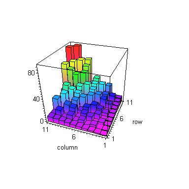 plots[matrixplot](aa, axes = boxed, shading = zhue, orientation = [-160, 57], heights = histogram, projection = .5)