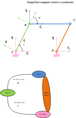For the moment, i only find in the tutorials system modeled with complete joint (or relative) coordinates. I will give the example of a 4 bars mechanism. The kinematic scheme with this complete joint coordinates is the following :