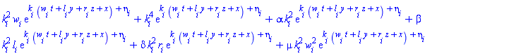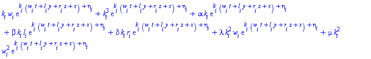 k[i]^2*w[i]*exp(k[i]*(t*w[i]+y*l[i]+z*r[i]+x)+eta[i])+k[i]^4*exp(k[i]*(t*w[i]+y*l[i]+z*r[i]+x)+eta[i])+alpha*k[i]^2*exp(k[i]*(t*w[i]+y*l[i]+z*r[i]+x)+eta[i])+beta*k[i]^2*l[i]*exp(k[i]*(t*w[i]+y*l[i]+z*r[i]+x)+eta[i])+delta*k[i]^2*r[i]*exp(k[i]*(t*w[i]+y*l[i]+z*r[i]+x)+eta[i])+mu*k[i]^2*w[i]^2*exp(k[i]*(t*w[i]+y*l[i]+z*r[i]+x)+eta[i])
