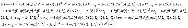 IM := 24*U(xi)*k^2*s^2-24*U(xi)*k^2*w^2-24*U(xi)*alpha*k^5*s*c[1]+240*(diff(diff(U(xi), xi), xi))*alpha*k^3*s*c[1]-24*U(xi)^3*beta*k*s*c[2]-120*(diff(diff(diff(diff(U(xi), xi), xi), xi), xi))*alpha*k*s*c[1]+U(xi)*k^5*w*c[1]+4*(diff(diff(U(xi), xi), xi))*k^3*v*c[1]-6*(diff(diff(U(xi), xi), xi))*k^3*w*c[1]+24*U(xi)^3*k*w*c[2]-4*(diff(diff(diff(diff(U(xi), xi), xi), xi), xi))*k*v*c[1]+(diff(diff(diff(diff(U(xi), xi), xi), xi), xi))*k*w*c[1]-24*(diff(diff(U(xi), xi), xi))*s^2+24*(diff(diff(U(xi), xi), xi))*v^2 = 0