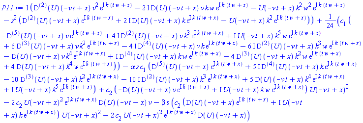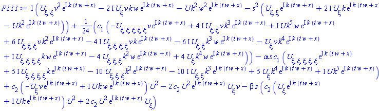 I*(((D@@2)(U))(-t*v+x)*v^2*exp(I*k*(t*w+x))-(2*I)*(D(U))(-t*v+x)*v*k*w*exp(I*k*(t*w+x))-U(-t*v+x)*k^2*w^2*exp(I*k*(t*w+x))-s^2*(((D@@2)(U))(-t*v+x)*exp(I*k*(t*w+x))+(2*I)*(D(U))(-t*v+x)*k*exp(I*k*(t*w+x))-U(-t*v+x)*k^2*exp(I*k*(t*w+x))))+(1/24)*c[1]*(-((D@@5)(U))(-t*v+x)*v*exp(I*k*(t*w+x))+(4*I)*((D@@2)(U))(-t*v+x)*v*k^3*exp(I*k*(t*w+x))+I*U(-t*v+x)*k^5*w*exp(I*k*(t*w+x))+6*((D@@3)(U))(-t*v+x)*v*k^2*exp(I*k*(t*w+x))-(4*I)*((D@@4)(U))(-t*v+x)*v*k*exp(I*k*(t*w+x))-(6*I)*((D@@2)(U))(-t*v+x)*k^3*w*exp(I*k*(t*w+x))-(D(U))(-t*v+x)*v*k^4*exp(I*k*(t*w+x))+I*((D@@4)(U))(-t*v+x)*k*w*exp(I*k*(t*w+x))-4*((D@@3)(U))(-t*v+x)*k^2*w*exp(I*k*(t*w+x))+4*(D(U))(-t*v+x)*k^4*w*exp(I*k*(t*w+x)))-alpha*s*c[1]*(((D@@5)(U))(-t*v+x)*exp(I*k*(t*w+x))+(5*I)*((D@@4)(U))(-t*v+x)*k*exp(I*k*(t*w+x))-10*((D@@3)(U))(-t*v+x)*k^2*exp(I*k*(t*w+x))-(10*I)*((D@@2)(U))(-t*v+x)*k^3*exp(I*k*(t*w+x))+5*(D(U))(-t*v+x)*k^4*exp(I*k*(t*w+x))+I*U(-t*v+x)*k^5*exp(I*k*(t*w+x)))+c[2]*(-(D(U))(-t*v+x)*v*exp(I*k*(t*w+x))+I*U(-t*v+x)*k*w*exp(I*k*(t*w+x)))*U(-t*v+x)^2-2*c[2]*U(-t*v+x)^2*exp(I*k*(t*w+x))*(D(U))(-t*v+x)*v-beta*s*(c[2]*((D(U))(-t*v+x)*exp(I*k*(t*w+x))+I*U(-t*v+x)*k*exp(I*k*(t*w+x)))*U(-t*v+x)^2+2*c[2]*U(-t*v+x)^2*exp(I*k*(t*w+x))*(D(U))(-t*v+x))