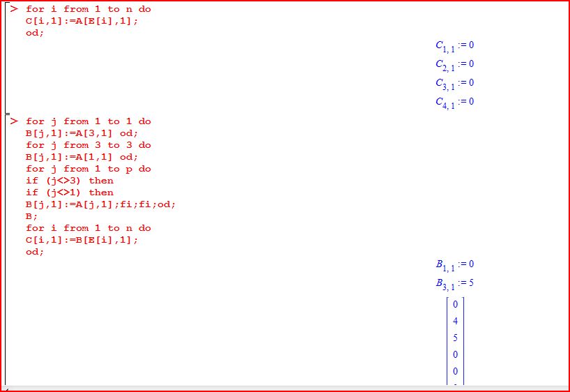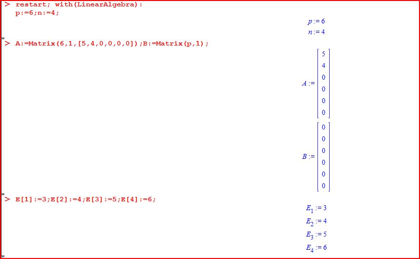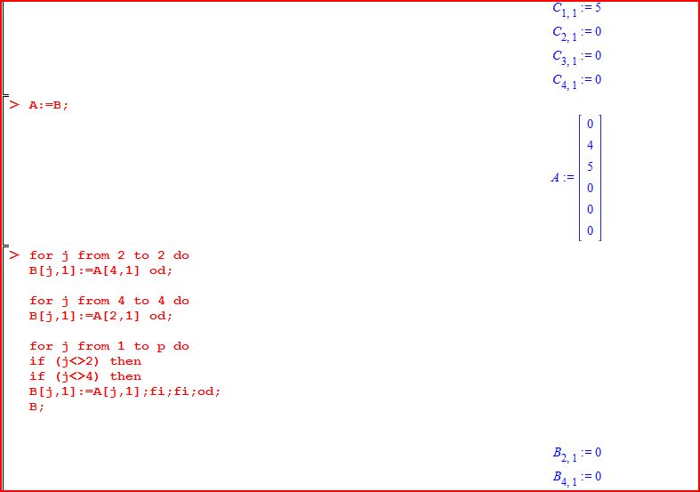 restart; with(LinearAlgebra):p:=6;n:=4;A:=Matrix(6,1,[5,4,0,0,0,0]);B:=Matrix(p,1);E[1]:=3;E[2]:=4;E[3]:=5;E[4]:=6;for i from 1 to n doC[i,1]:=A[E[i],1];od;for j from 1 to 1 doB[j,1]:=A[3,1] od;for j from 3 to 3 do B[j,1]:=A[1,1] od;for j from 1 to p doif (j<>3) thenif (j<>1) thenB[j,1]:=A[j,1];fi;fi;od;B;for i from 1 to n doC[i,1]:=B[E[i],1];od;A:=B;for j from 2 to 2 doB[j,1]:=A[4,1] od;