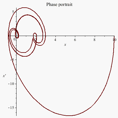 plots:-odeplot(Sol2, [[x(t), diff(x(t),t)]], t= 0..25, numpoints= 1000, thickness= 2, title= "Phase portrait", gridlines= false);