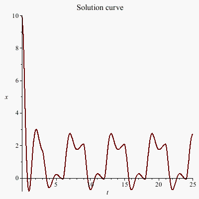 plots:-odeplot(Sol2, [t, x(t)], t= 0..25, numpoints= 1000, thickness= 2, title= "Solution curve", gridlines= false);