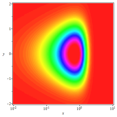 10^x*exp(-(10^x)^2-y^2), x= log10(.01)..log10(10), y= -2..2,