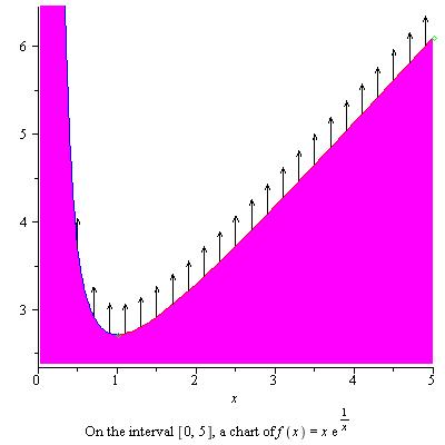 Student[Calculus1][FunctionChart](x*exp(1/x),x=0..5);
