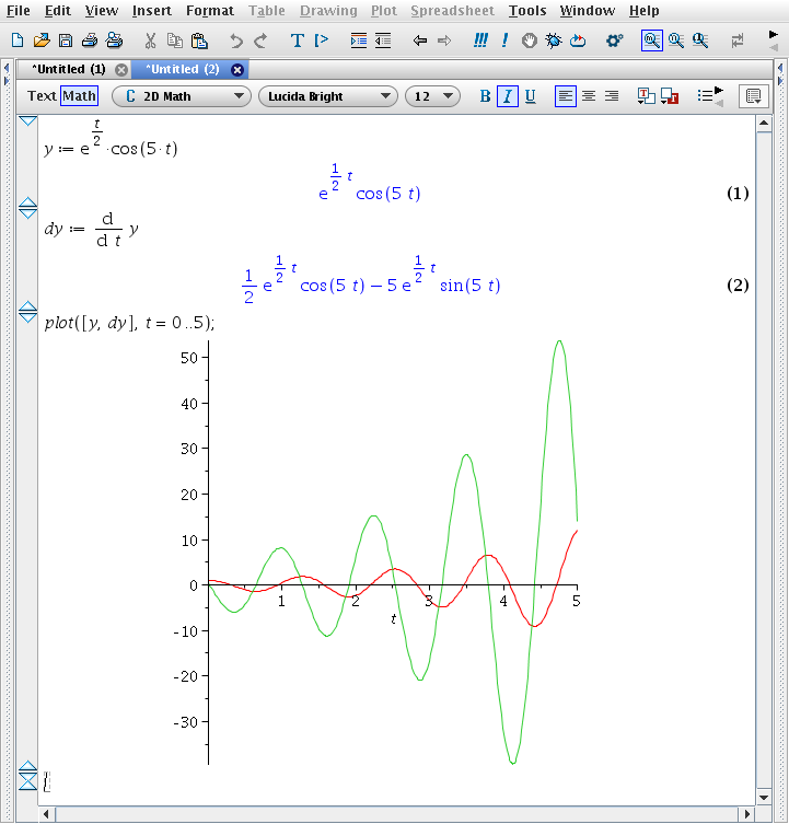 then take the derivative of y with respect to t. If you want to plot both y and its derivative with respect to t, you might assign the derivative to a separate variable and then plot them both: