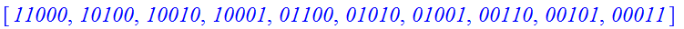 [[1, 1, 0, 0, 0], [1, 0, 1, 0, 0], [1, 0, 0, 1, 0], [1, 0, 0, 0, 1], [0, 1, 1, 0, 0], [0, 1, 0, 1, 0], [0, 1, 0, 0, 1], [0, 0, 1, 1, 0], [0, 0, 1, 0, 1], [0, 0, 0, 1, 1]]