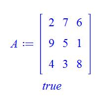 A:=<2,7,6; 9,5,1; 4,3,8>;