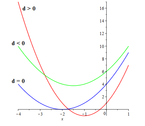 T:=plots:-textplot([[-4,4.5,"d = 0"],[-4,10.5,"d < 0"],[-3.5,16,"d > 0"]], font=[roman,bold,16]):