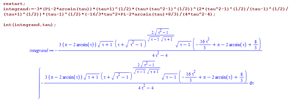 expr := Int(sqrt(-2*alpha^2*x - 2*alpha^2 + 4)/sqrt(-alpha^2 + 1)/(-alpha^2*x - alpha^2 + 2), alpha = 0 .. z);