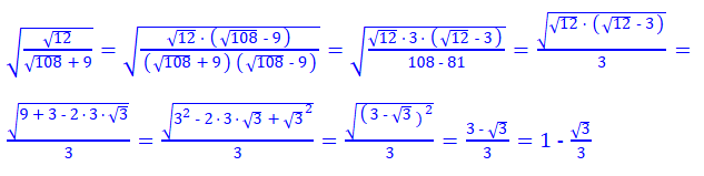 This example is fairly easy to solve by hand without Maple. First, we remove the irrationality from the denominator, then simplify the expression under the external root and represent it as a square.