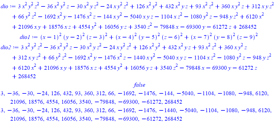 dio := 3*x^2*y^2*z^2-36*x^2*y^2*z-30*x^2*y*z^2-24*x*y^2*z^2+126*x^2*y^2+432*x^2*y*z+93*x^2*z^2+360*x*y^2*z+312*x*y*z^2+66*y^2*z^2-1692*x^2*y-1476*x^2*z-144*x*y^2-5040*x*y*z-1104*x*z^2-1080*y^2*z-948*y*z^2+6120*x^2+21096*x*y+18576*x*z+4554*y^2+16056*y*z+3540*z^2-79848*x-69300*y-61272*z+268452;