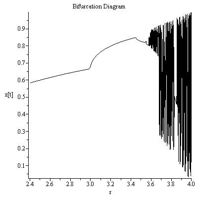 listplot([seq([r, X(r)[200]], r = 2.4 .. 4, 0.1e-2)], title = "Bifurcation Diagram", labels = ["r", "x[t]"]);