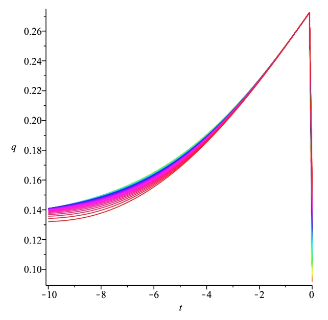 EDIT : the plot shows several trajectories of the system of ODEs, for different initial conditions (starting at time 0 and running time backwards towards negative values).