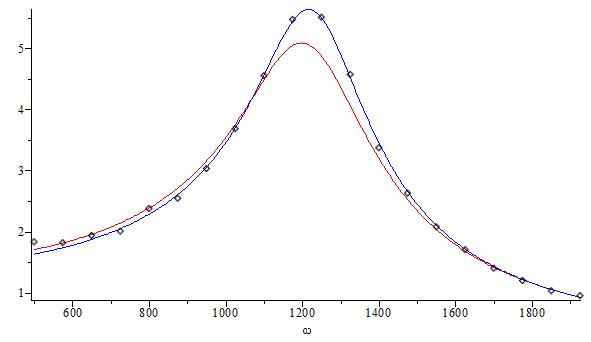 display(plot([eval(resonance(omega),MBvalues),eval(resonance(omega),MBvalues2)],omega=500 .. 1925, colour=[red,blue]),pointplot(data));