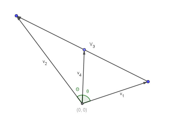 "dot product of two vectors = the magnitude times the cos of the angle between them.  angle between v1 and v4 = angle between v2 and v4  Here  I have squared the dot product to remove square roots  "