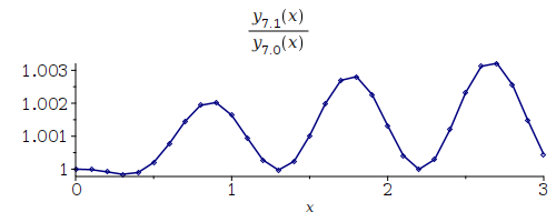 plot(A, F(7.1)/~F(7.0), title=y[7.1](x)/y[7.0](x), color="Navy") ]));